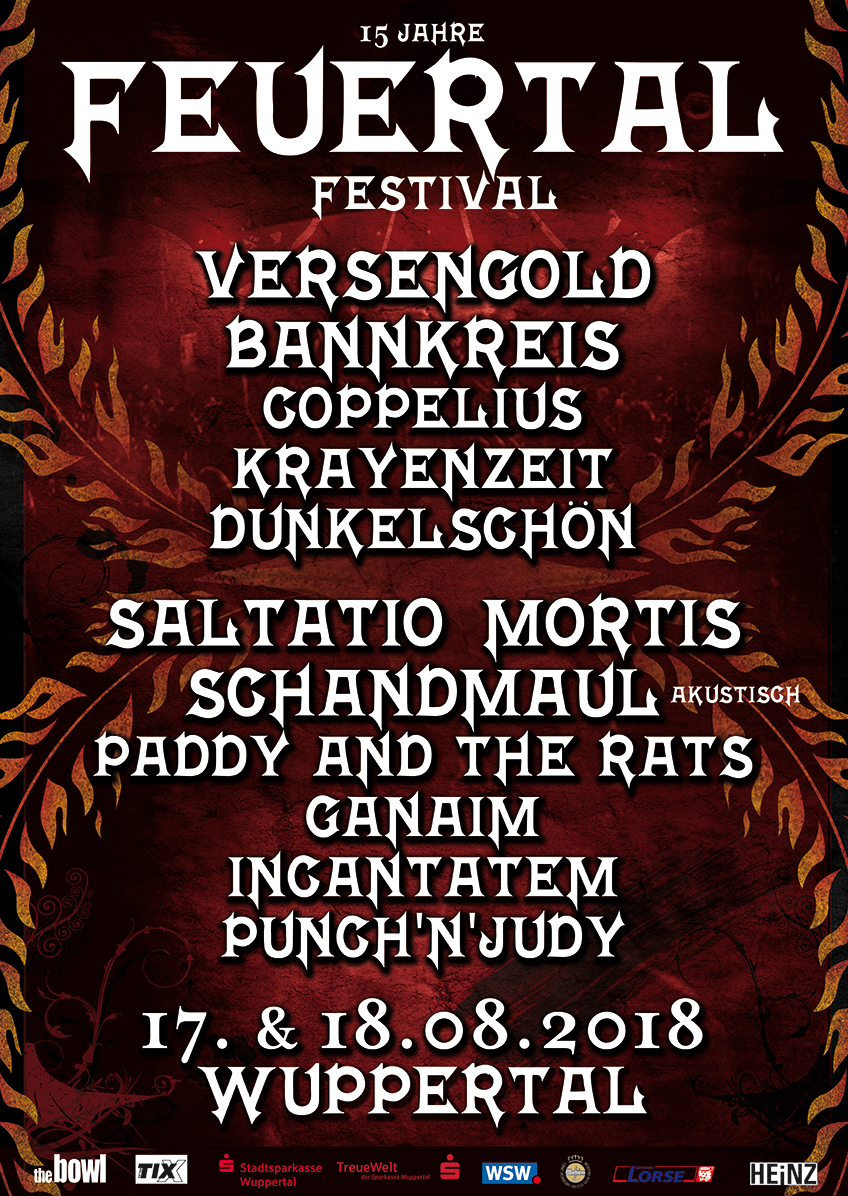 Das Line Up des Festivals trägt den Ansprüchen eines Jubiläums Rechnung: Mit Schandmaul und Fiddler’s Green sind zwei langjährige Weggefährten des Feuertal Festivals am Start, dazu gesellt sich am Freitag-Abend mit Saltatio Mortis noch ein Top Act, der beim Feuertal Festival seine einzige NRW Show im Festival Sommer spielen wird. Dann gibt es auch erstmals Songs aus dem im August erscheinenden neuen Album zu hören! Man darf gespannt sein. Es lohnt sich also eine frühzeitige Kartenbeschaffung für das in der Regel schon früh ausverkaufte Festival.
